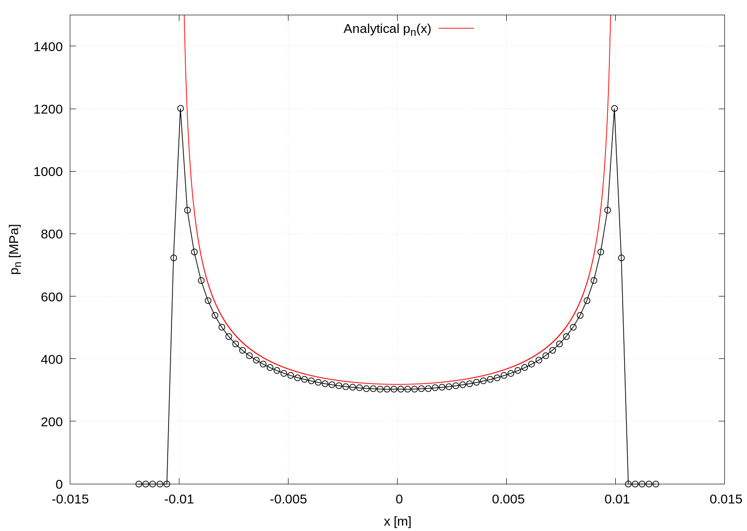 \[u_z(x) = u_z + \frac{2(1-\nu^2)F}{\pi E} \text{ ln} \left[ \frac{x}{a} + \sqrt{\frac{x^2}{a^2}-1} \right] \qquad \text{for } |x| \geq a.\]Figure 2 shows the distribution of the contact pressure. The diagram is created automatically within the Allrun script using sample utility and gnuplot. Further mesh refinement would lead to a closer approximation of the analytical solution. As the mesh is refined, the predicted contact pressure at the contact edge goes to infinity, as expected.