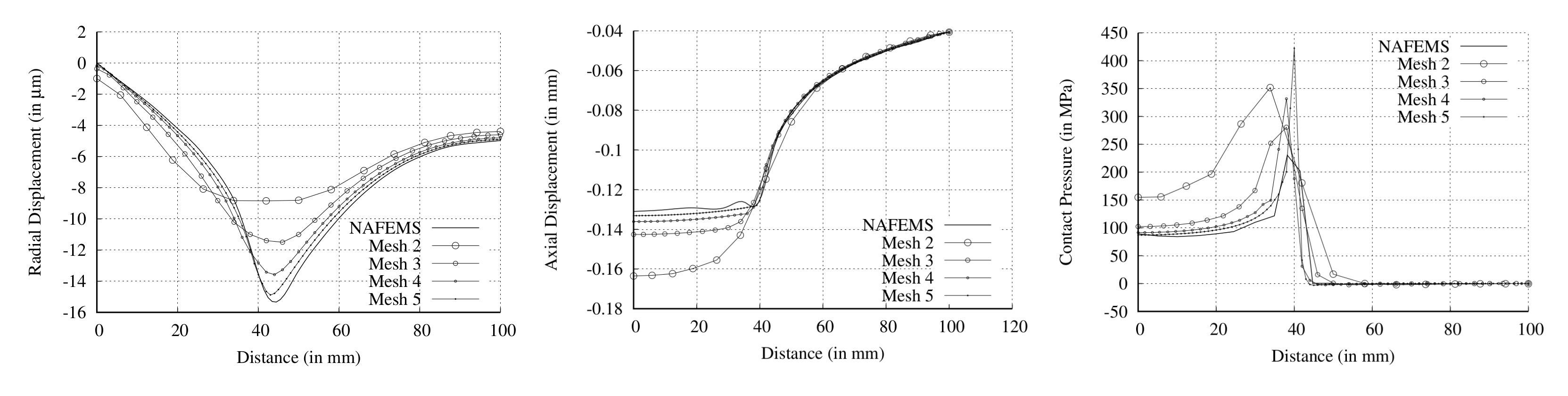 Figure 2 shows the convergence of axial displacement, radial displacement, and contact pressure as the mesh is refined [2]. The solids4foam results match well with results reported in the literature [1].