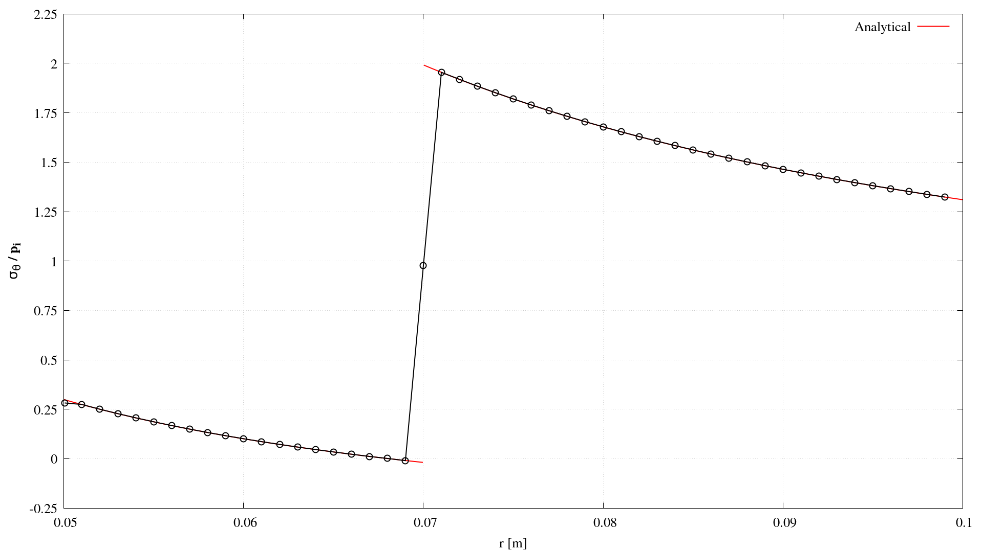 Comparison between numerical and analytical solutions is performed in terms of circumferential and radial stresses in the radial direction through the cylinder, for which the analytical solutions are as follows [1]: