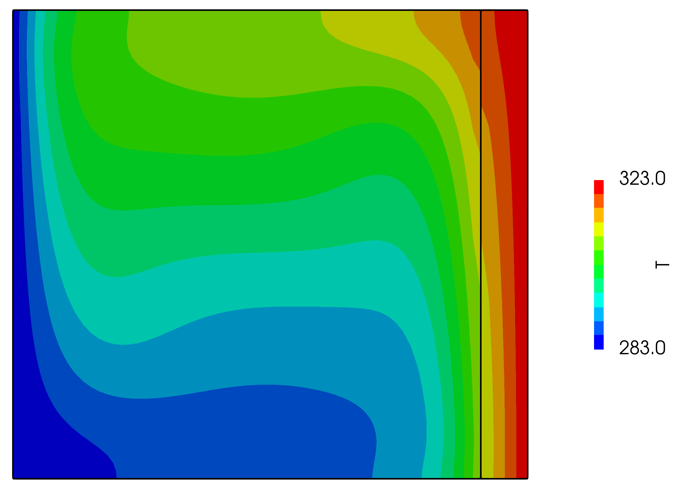 Over the duration of the simulation, the solid heats the fluid, causing a thermal circulation to form in the fluid. The evolution of the temperature of velocity fields is shown in Video 1. The temperature distribution at \(t = 10\) s is shown in Figure 2.